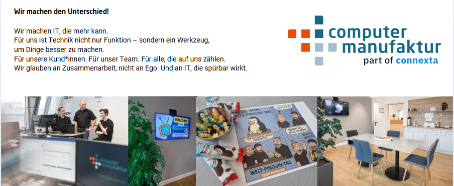 Wir garantieren eine verantwortungsvolle und vielseitige Tätigkeit in einem lebendigen Team. Bei der Computer Manufaktur schätzen wir die individuellen Stärken unserer MitarbeiterInnen und bieten Raum für persönliche und berufliche Entwicklung. Die Karriere bei der Computer Manufaktur - mehr als nur ein Job, sondern eine Chance, deine beruflichen Ziele zu verwirklichen und gemeinsam mit uns zu wachsen.